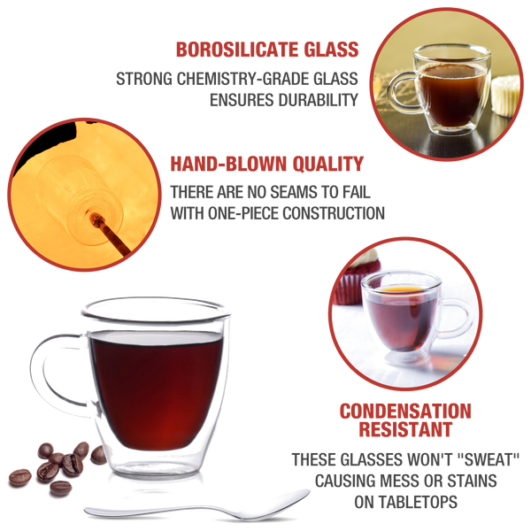 jamie These are good glasses for espresso, no doubt about it.price is on pointGood size to fix an espresso shot or doubleComfortable to holdCould they be better, I think so : the walls feel really thin and after a minute or two you can feel the heat on the outside of the glass, but they do keep the espresso warming then most glasses